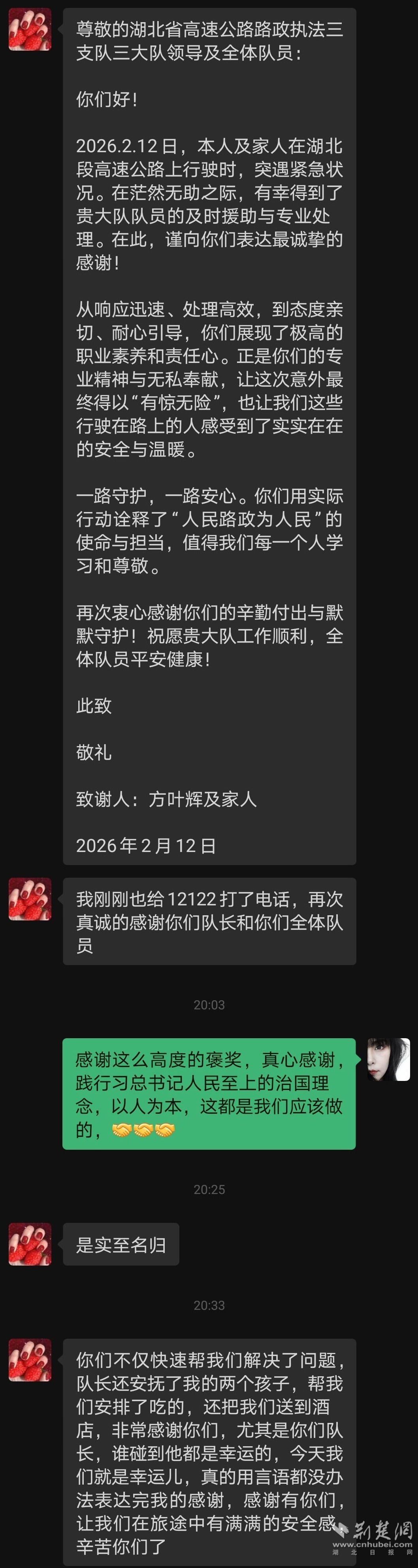 执法人员返程途中,此前因处理事故添加的方女士微信传来消息——一封情真意切的感谢信,信中对大队的单位名称标注得准确无误。原来,是方女士懂事的女儿,悄悄拍下了大队的门牌照片,帮妈妈准确记下了这份温暖的归属。一句“让我们这些行驶在路上的人感受到了实实在在的安全与温暖”,是司乘人员对路政执法人员坚守春运一线、守护出行平安最朴实、最真挚的认可,也定格了春运路上最动人的温情瞬间。