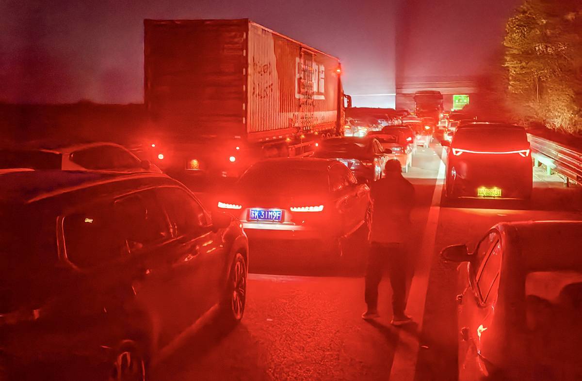 2月13日凌晨,沪蓉高速湖北钟祥市路段呈现出一条望不到头的“火龙”,许多车主下车在高速上走走。