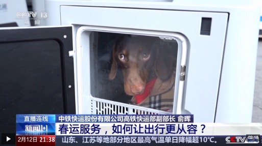 中铁快运股份有限公司高铁快运部副部长 俞晖:宠物托运的服务是铁路部门在2025年4月8日最先在京沪线推出的一项试点服务,经过了4次扩网,现在的办理车站达到110个,覆盖了除港澳台及新疆、西藏以外的直辖市、省会城市、计划单列市和部分的二、三线城市。扩网以后的单量由日均40单左右增长到了140单以上,尤其是进入到春运以后的这一周多时间来,已经上升到180单。从预约情况来看,未来的3天,我们将迎来办理的高峰,单日的办理量将突破300单。旅客携宠出行的需求还是非常强烈的。