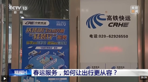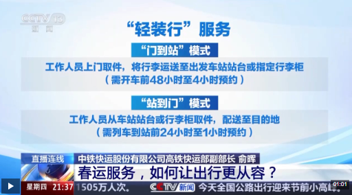 中铁快运股份有限公司高铁快运部副部长 俞晖:目前“轻装行”的服务,日均订单量大概在100单左右,相较于春运之前已经增加了70多单,运输的需求量还是非常大的。目前大部分需求是出发的旅客,主要是需要从酒店或者是家里帮旅客把行李搬运到出发乘车的火车站。现在像北京南站、北京西站、上海虹桥站、广州南站这些车站都是春运客流比较集中的车站。