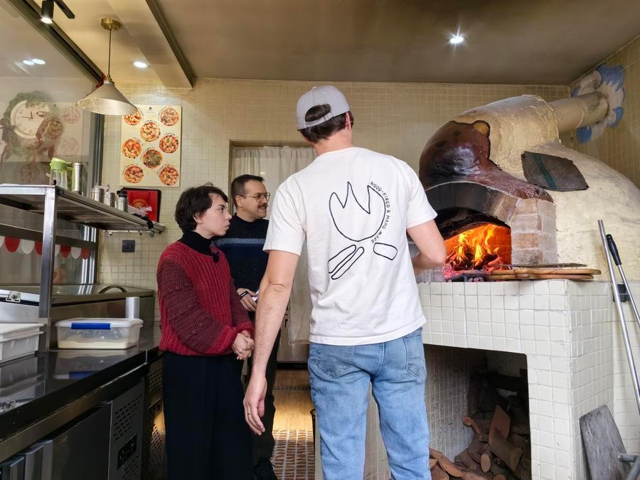 Adrien Brill (R), an American influencer, introduces his pizza oven to Italian couple Simona Maria Cannone (L) and Angelo Taraborrelli at his restaurant in Huangshan, east China's Anhui Province, March 13, 2025. (Xinhua/Chen Shangying)