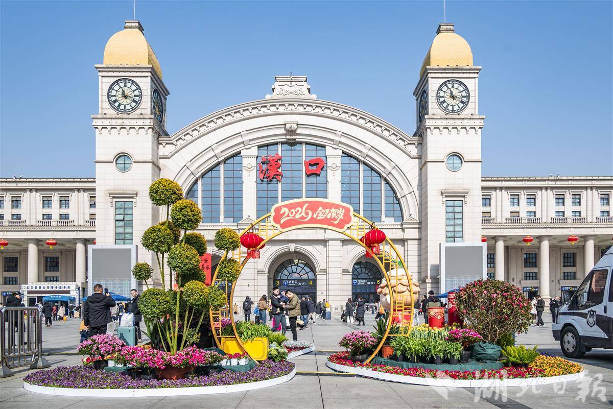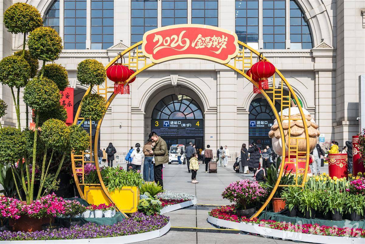 角堇、报春、紫罗兰、郁金香、茶梅球与亮晶女贞球错落有致,争奇斗艳。鲜花丛中,换上唐装、手持灯笼的“松仔”憨态可掬,孩子们争相与他牵手合影;拖着行李箱的旅客也纷纷停下脚步,掏出手机记录这抹亮色。一位归乡的旅客感慨:“刚下火车就看到这么喜庆的布置,‘逛江汉过大年’,这个邀请我收下了!”