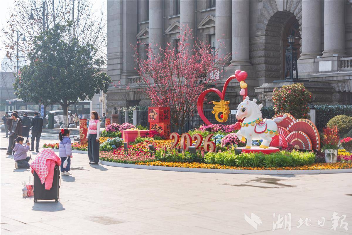 湖北日报讯(记者张竞恒、通讯员李军、申燕伟、何超)春节临近,武汉市江汉区节日氛围日渐浓厚。2月13日,以江汉关、汉口火车站为核心打造的“福马迎春”与“松仔迎宾”两大园林主题景观全面亮相,通过融合传统年俗、地域文化与现代园艺手法,将江汉的年味“拉满”,吸引不少市民游客专程前来打卡拍照。人们在花团锦簇与装置艺术间流连忘返,纷纷感叹:“春节来了,年味足了!”