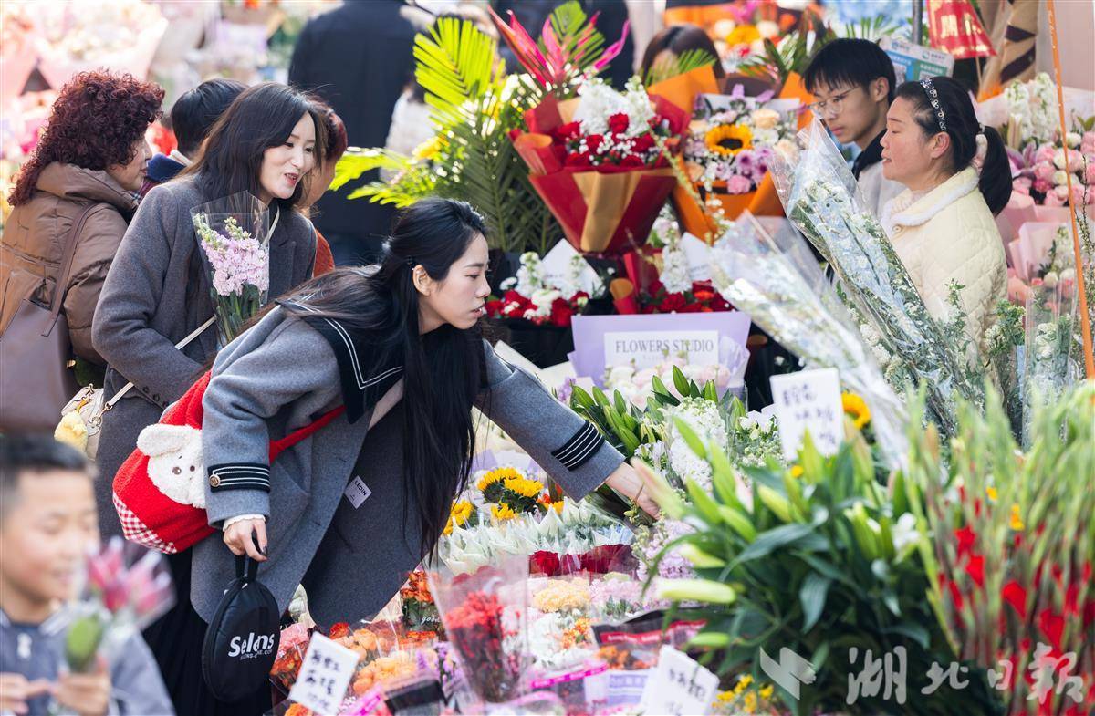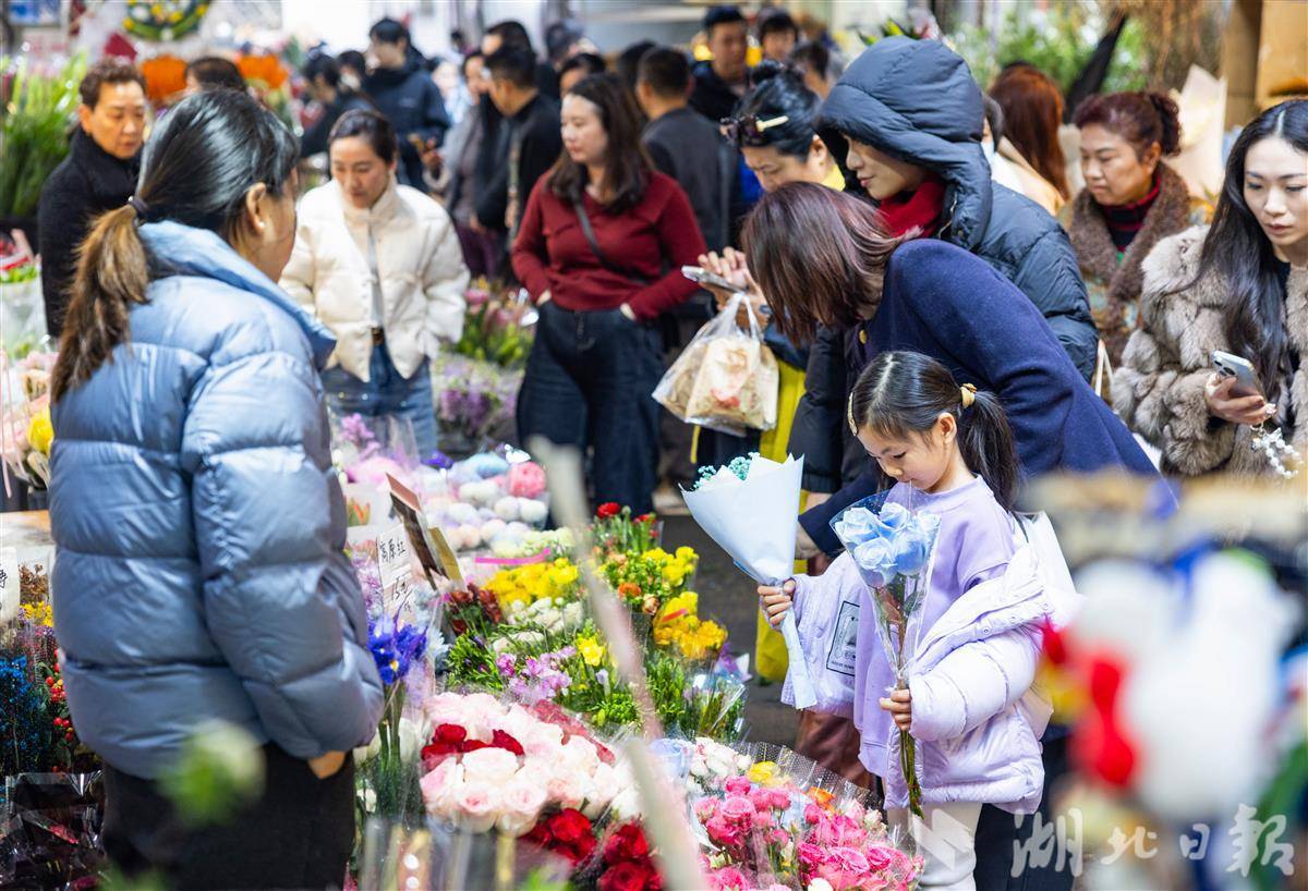 2月13日,武汉循礼门花卉市场,摆满了各式各样的鲜花、盆栽,前来选购的市民络绎不绝,洋溢着喜庆的年味。(湖北日报全媒记者 薛婷 摄)