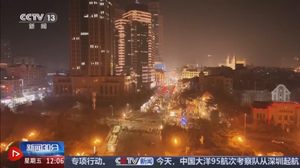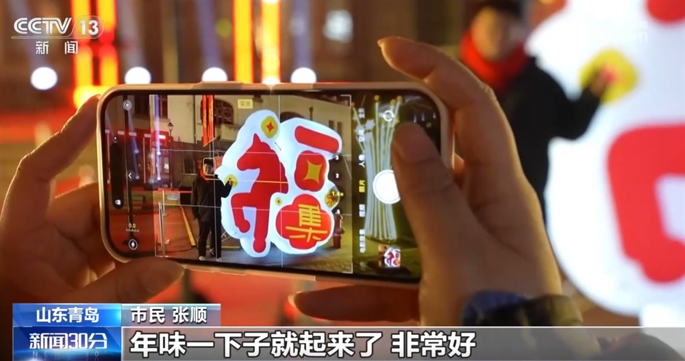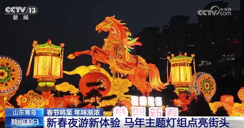 在山东青岛,百盏彩灯装点城区的大街小巷。五四广场上,以“骏马迎春,福至青岛”为主题的灯组精彩点亮。在中山路历史文化街区,骏马迎福、鱼跃龙门等数十组灯组同时点亮,夜幕下流光溢彩,市民游客漫步其中,感受浓浓年味。