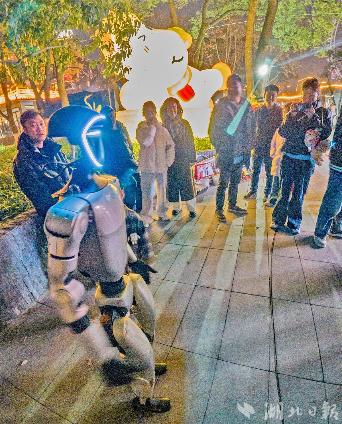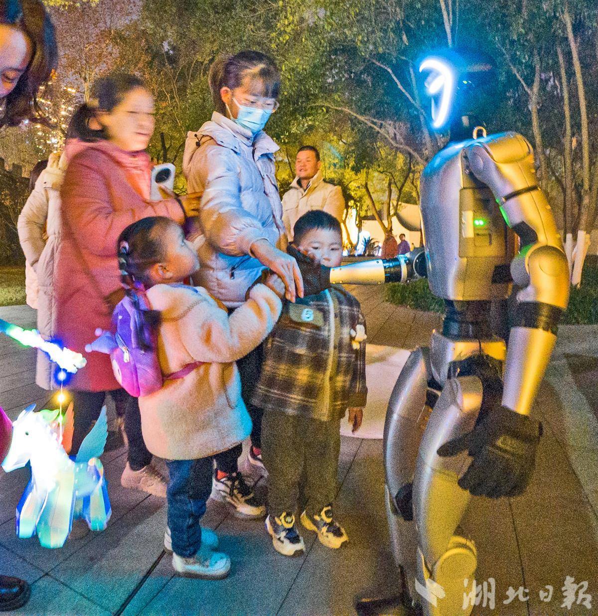 2月12日,宜昌新春灯展游园现场新意满满,机器人、机器狗结伴 “夜游” 花灯,灵动可爱的科技萌宠一亮相,便吸引孩子们追逐互动,欢声笑语不断。传统花灯与智能科技趣味碰撞,为新春赏灯增添别样欢乐,市民携家带口赏灯打卡,沉浸在喜庆祥和的节日氛围中。(湖北日报全媒记者 刘曙松 摄)