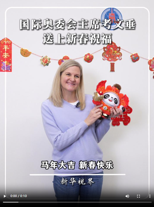 2026年2月13日,国际奥委会主席考文垂在新华社米兰冬奥会报道中心展示“马墩墩”。新华社记者 张铖 摄