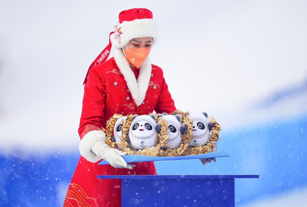 2022年2月12日,北京冬奥会纪念品颁发仪式工作人员摆放“冰墩墩”纪念品。新华社记者 许畅 摄