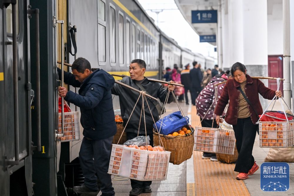 ↑ 2月12日,村民挑着新鲜果蔬准备搭乘7272次公益性“慢火车”前往贵州铜仁。新华社记者 刘续 摄