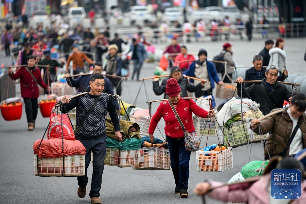 ↑ 2月12日,在贵州省铜仁市铜仁站,来自湖南的菜农挑着果蔬出站,准备前往附近的农贸市场进行销售。新华社发(袁福洪 摄)