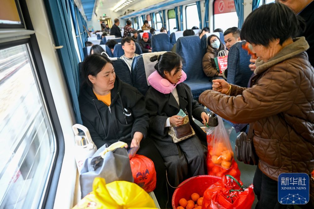 ↑ 2月12日,在7272次列车车厢内,来自湖南的村民(左)和乘客进行交易。新华社发(龙建睿 摄)