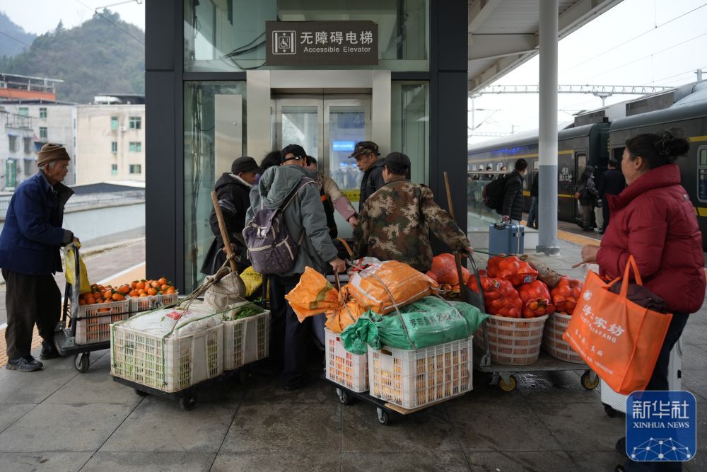 ↑ 2月12日,在贵州省铜仁市铜仁火车站,来自湖南的村民带着蔬果准备乘坐无障碍电梯出站。新华社发(龙建睿 摄)