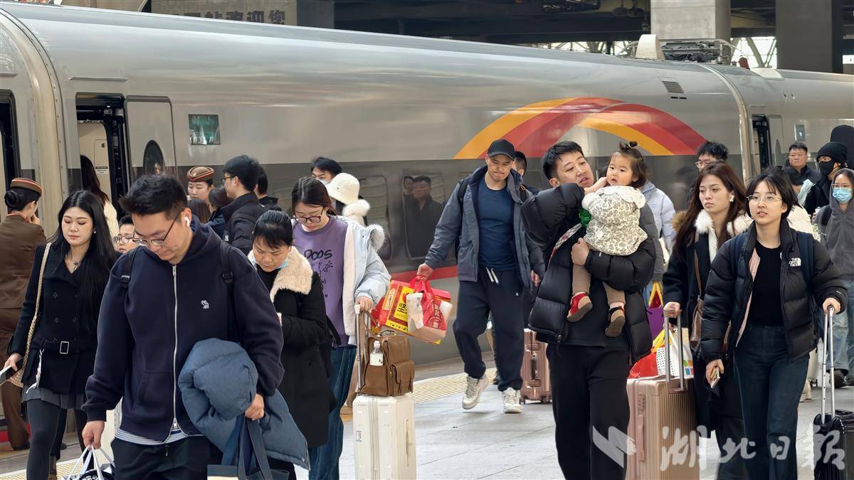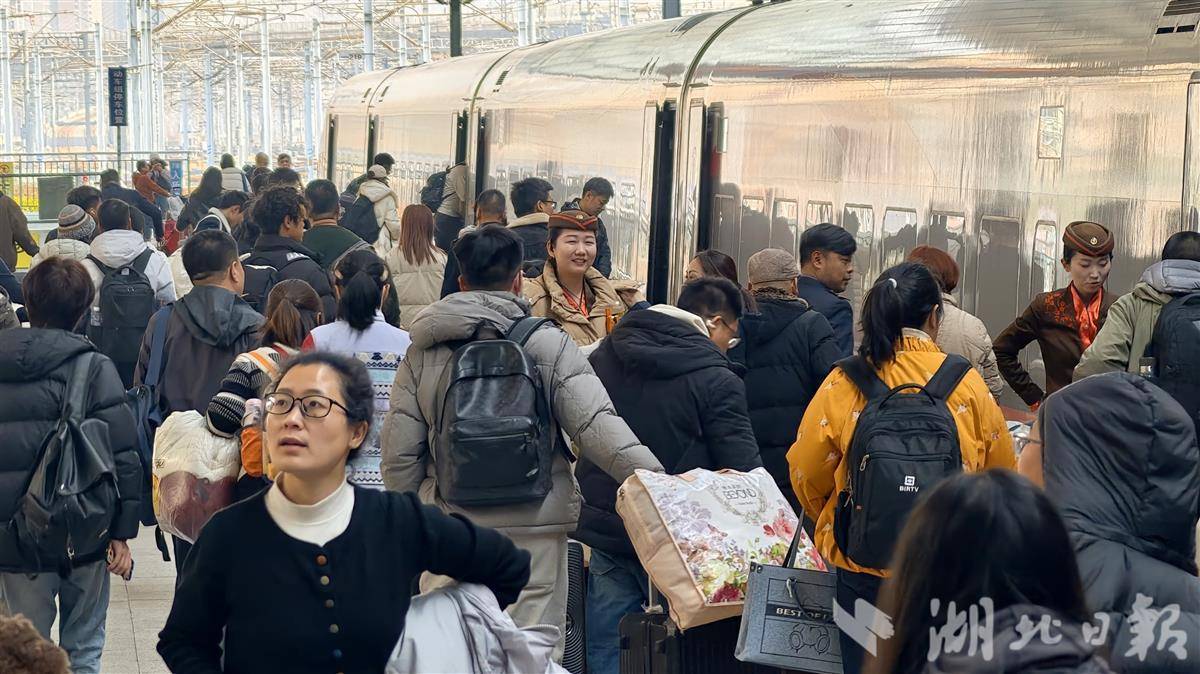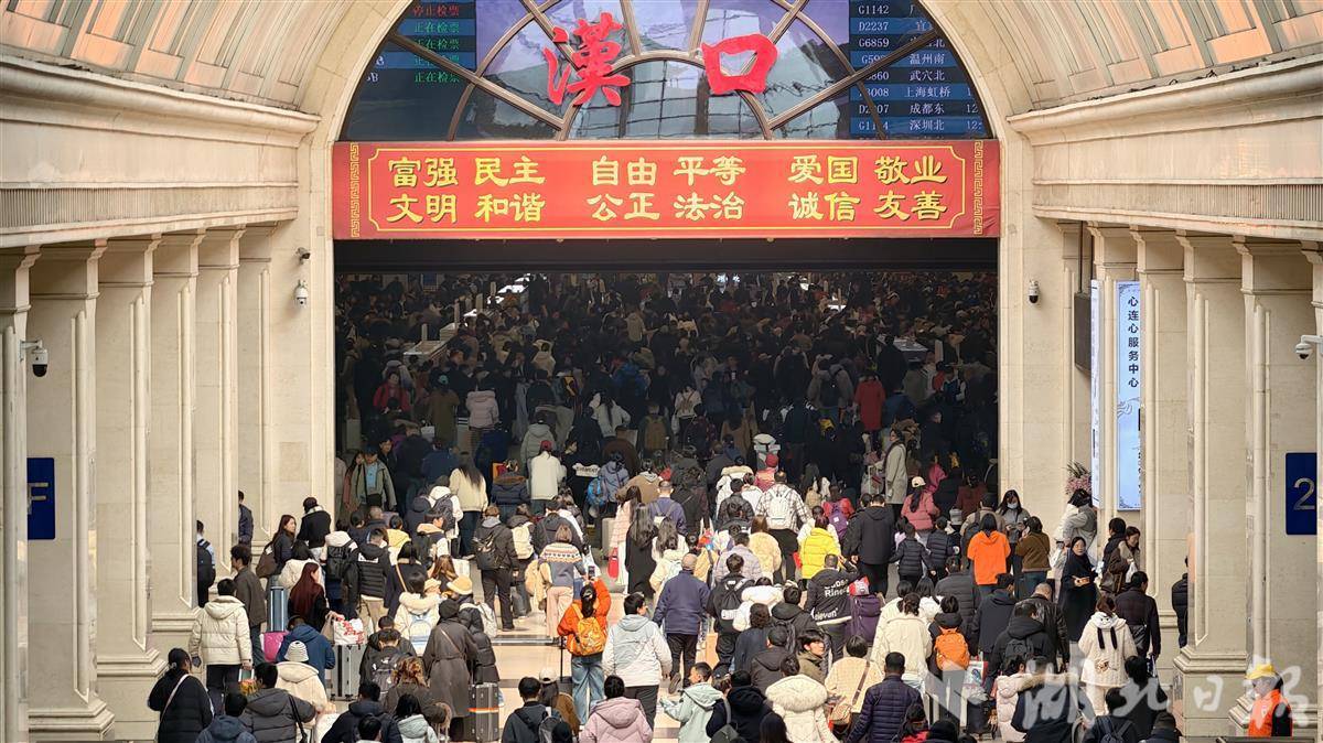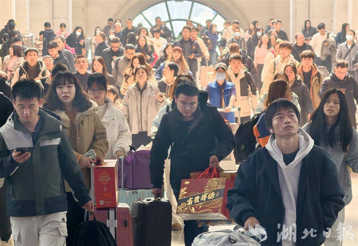 2月14日,春节假期前一天,汉口火车站迎来节前出行高峰。旅客们携箱负囊步履不停,眉眼间尽是归家的喜悦。(湖北日报全媒记者 陈少哲 摄)