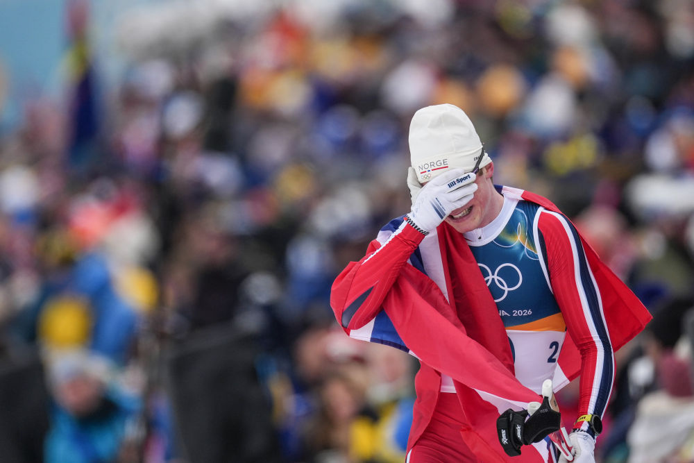 2月10日,挪威选手维凯在越野滑雪男子个人短距离(传统技术)决赛后掩面而泣。新华社记者 彭子洋 摄