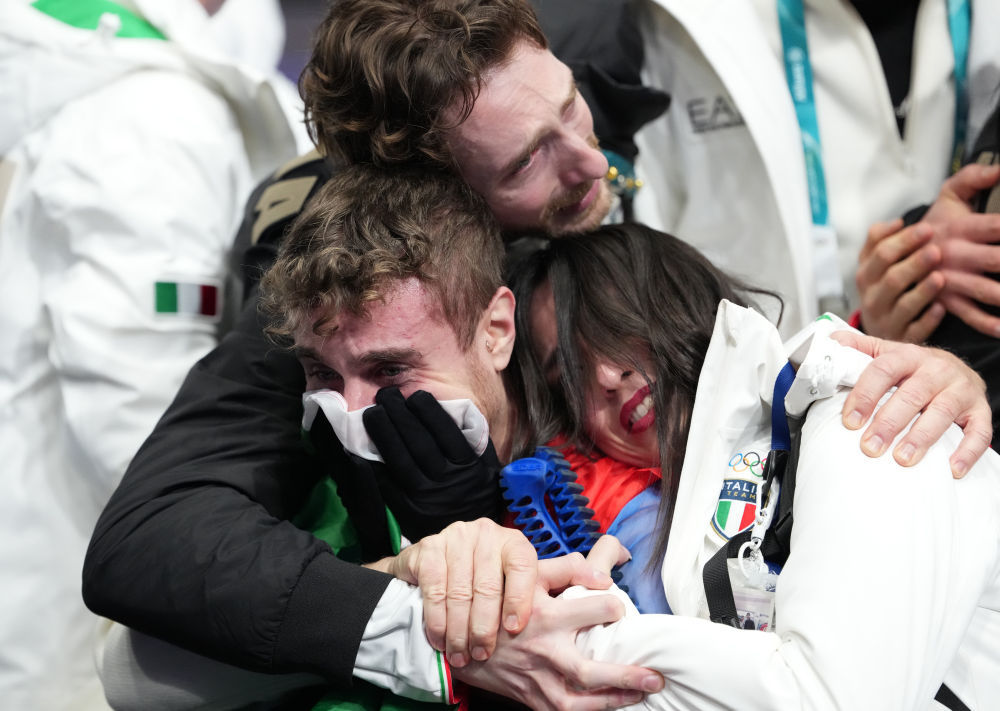 2月8日,意大利队选手里佐在花样滑冰项目团体赛男单自由滑完赛后。新华社记者 薛宇舸 摄