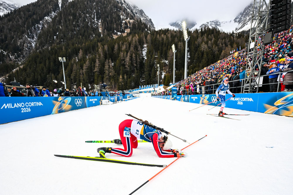2月10日,挪威选手斯图拉·霍尔姆·莱格雷德(前)在冬季两项男子20公里个人赛冲线后倒地。新华社记者 江汉 摄