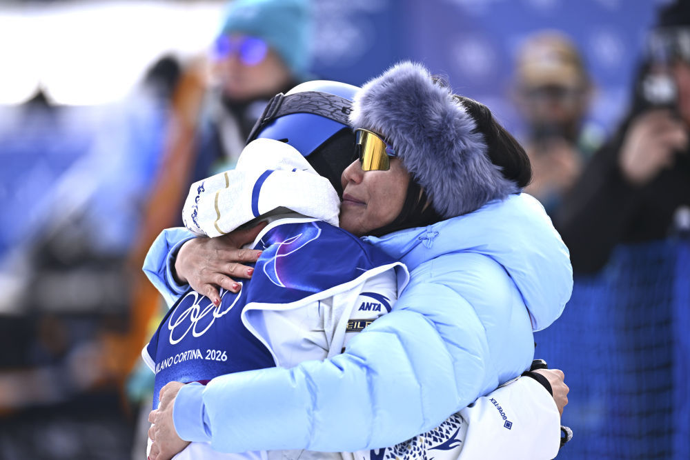 2月9日,中国选手谷爱凌(左)在完成自由式滑雪女子坡面障碍技巧决赛第一跳后和母亲拥抱。新华社记者 张宏祥 摄