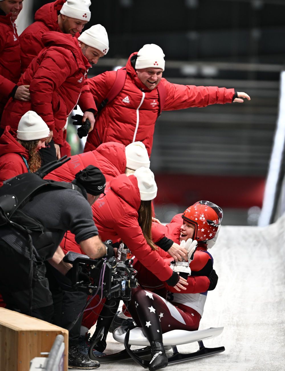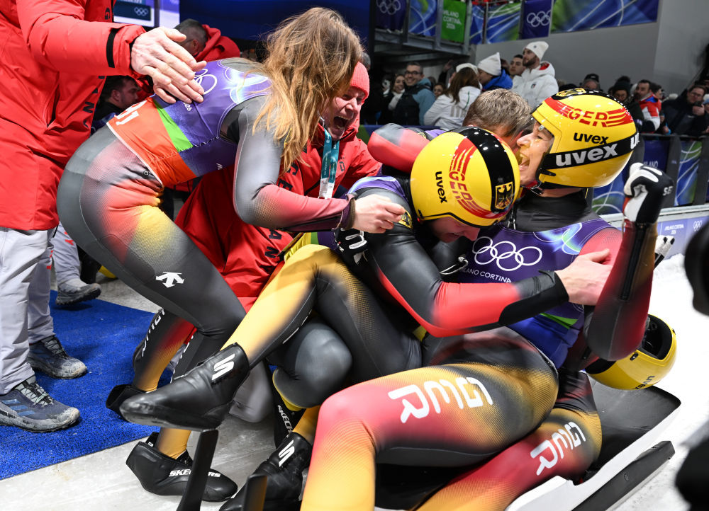 2月12日,冠军德国队在雪橇项目团体接力赛后庆祝。新华社记者 连漪 摄