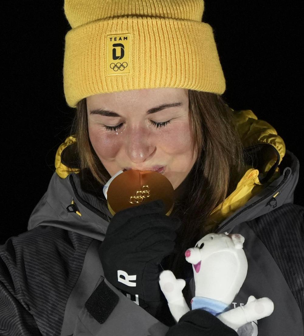 2月9日,瑞士选手玛蒂尔德·格雷莫德在自由式滑雪女子坡面障碍技巧决赛中庆祝夺冠。新华社记者 张宏祥 摄