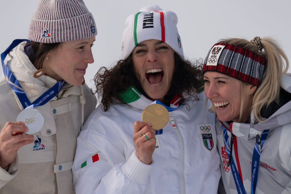 2月12日,冠军意大利选手费代丽卡·布里尼奥内(中)、亚军法国选手罗马娜·米拉多利(左)和季军奥地利选手科尔内利娅·许特尔在高山滑雪女子超级大回转颁奖仪式上。新华社记者 费茂华 摄