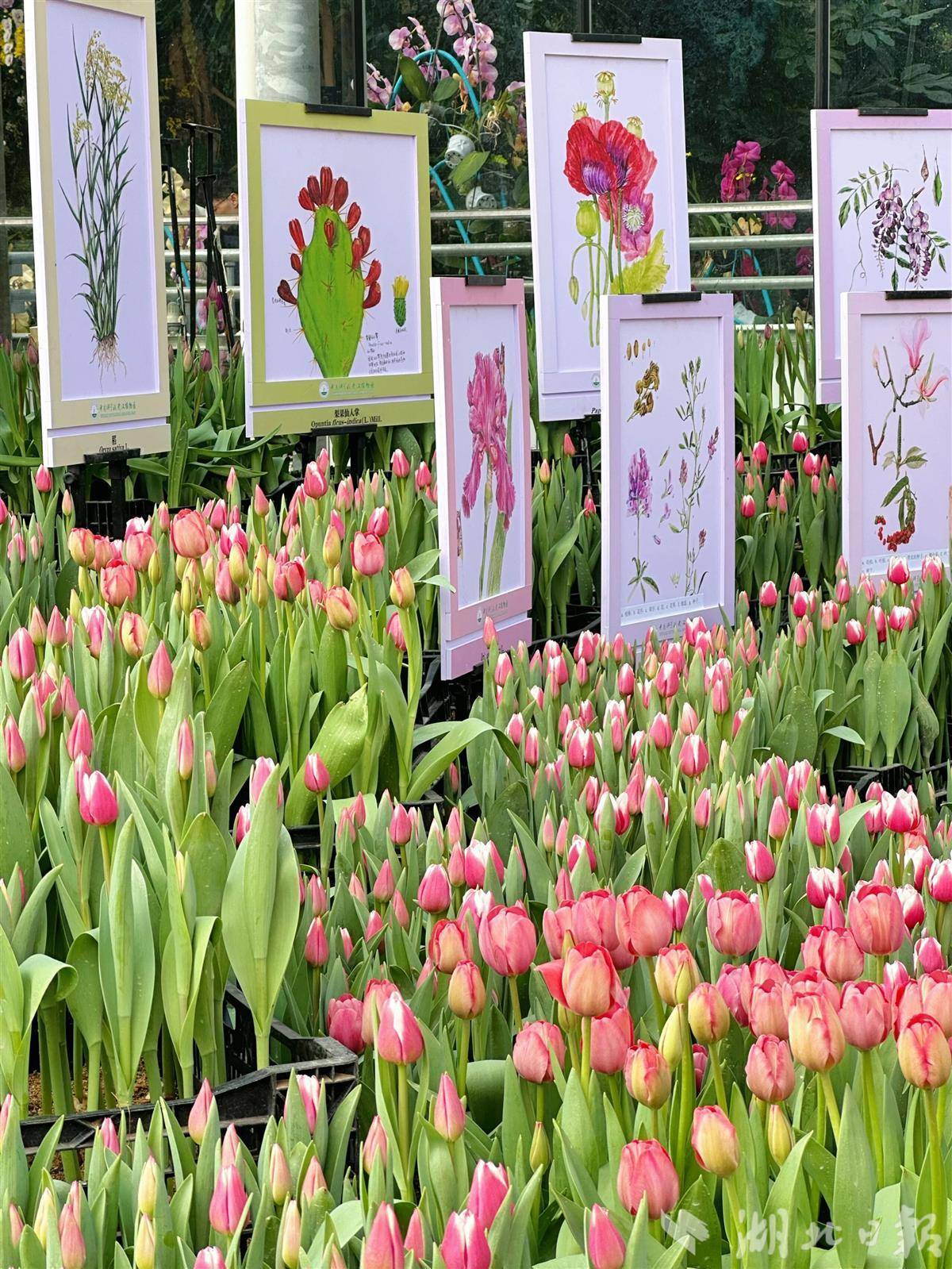 3万株郁金香连片绽放,红的热烈、黄的明媚、粉的娇嫩,11个品种的暖色系花朵交织在一起,像被打翻的调色盘,铺满了中心花坛、景观温室门口和园区主干道。“红色印记”奔放似火,“小黑人”神秘典雅,“纯金”则像洒满了阳光,漫步其间,仿佛一脚踩进了春天的怀抱。