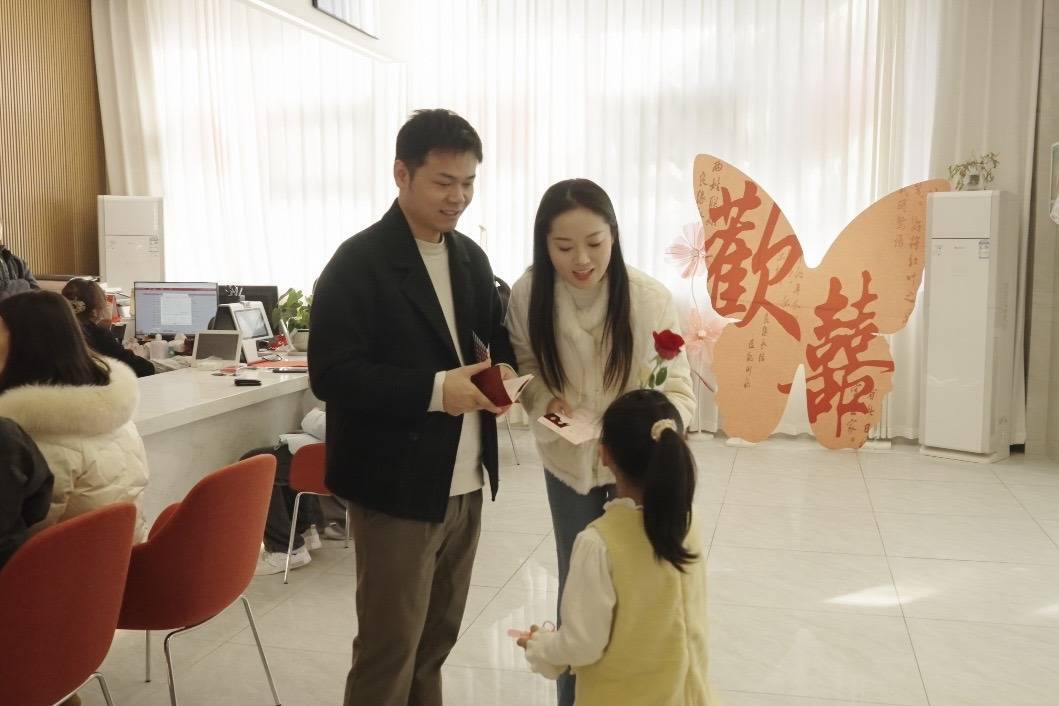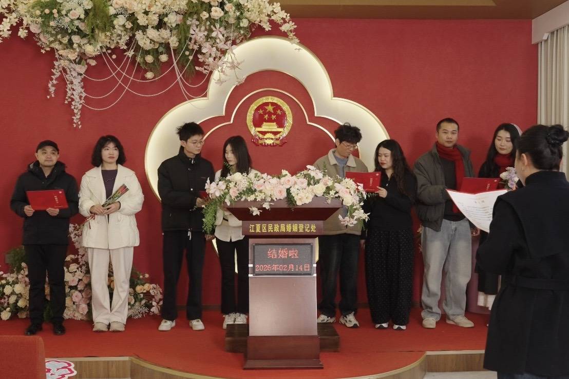 为了让这个特殊的日子更具仪式感,武汉多地婚登处纷纷推出特色主题活动。在武昌紫阳公园婚姻登记处,新人们不仅可以参与宋锦非遗手作,还能亲手体验婚书拓印非遗文化,在墨香中感受传统婚俗的独特魅力。江夏区燕尔阁婚登处婚俗文化馆展示传统婚俗文化,颁证厅设置浪漫打卡点,集体办证、趣味答题、拍照打卡等活动同步展开,新人们在满满的仪式感中喜结连理,为春节前的最后一个工作日画上了圆满而甜蜜的句号。(湖北日报全媒记者 杨文漪)