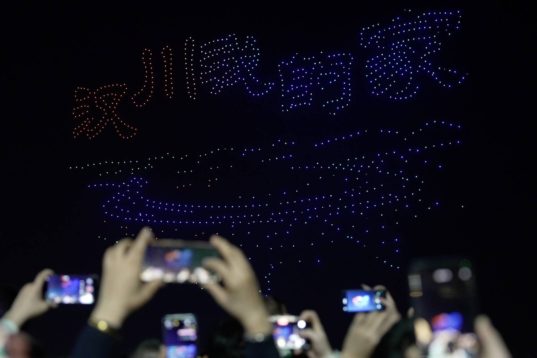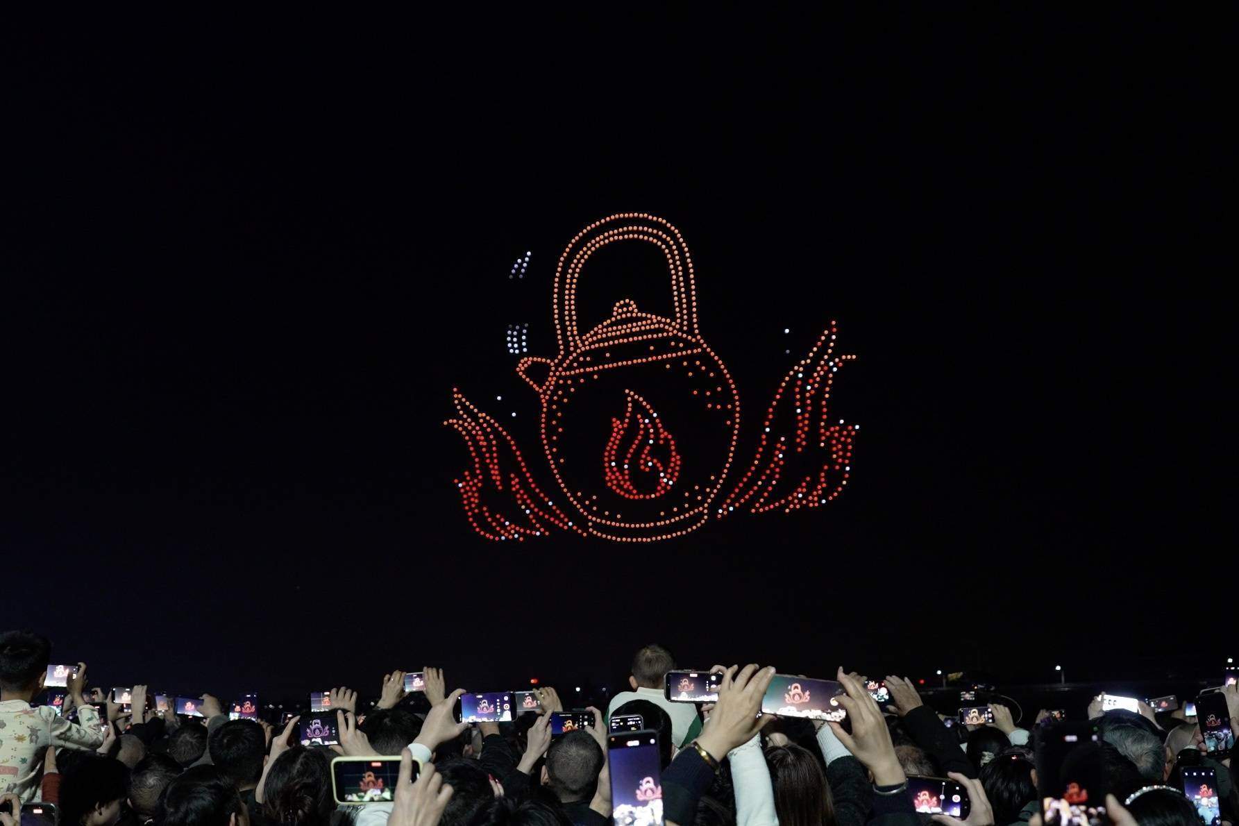 1000架无人机腾空而起,绘就12幅水乡特色画面。(湖北日报通讯员熊少海 摄)