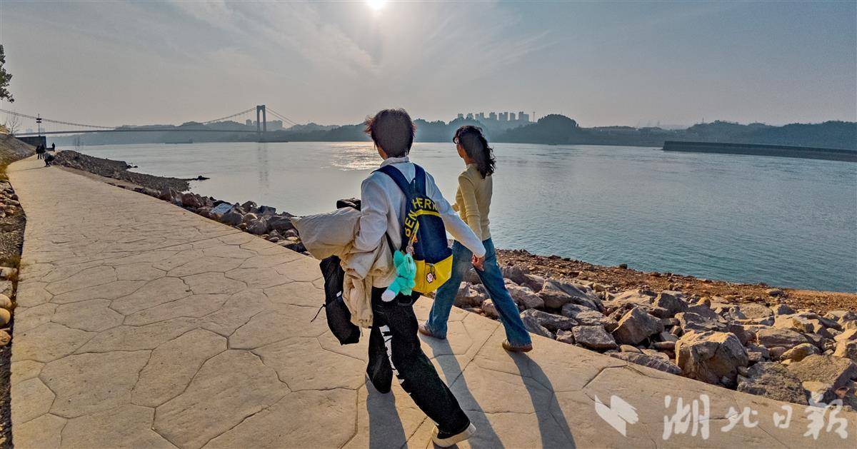 2月14日,阳光明媚,宜昌西坝长江边暖意融融。市民漫步江岸,尽享新春和煦暖阳,更有幸邂逅江豚在水中逐浪嬉戏,灵动身影为节日添上一抹生态惊喜。碧水、暖阳、江豚与市民相映成趣,绘就人与自然和谐共生的新春画卷,让宜昌的春节年味更显独特与温馨。(湖北日报全媒记者 刘曙松 摄)