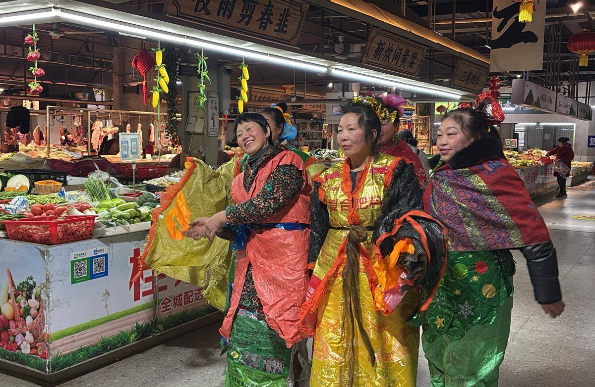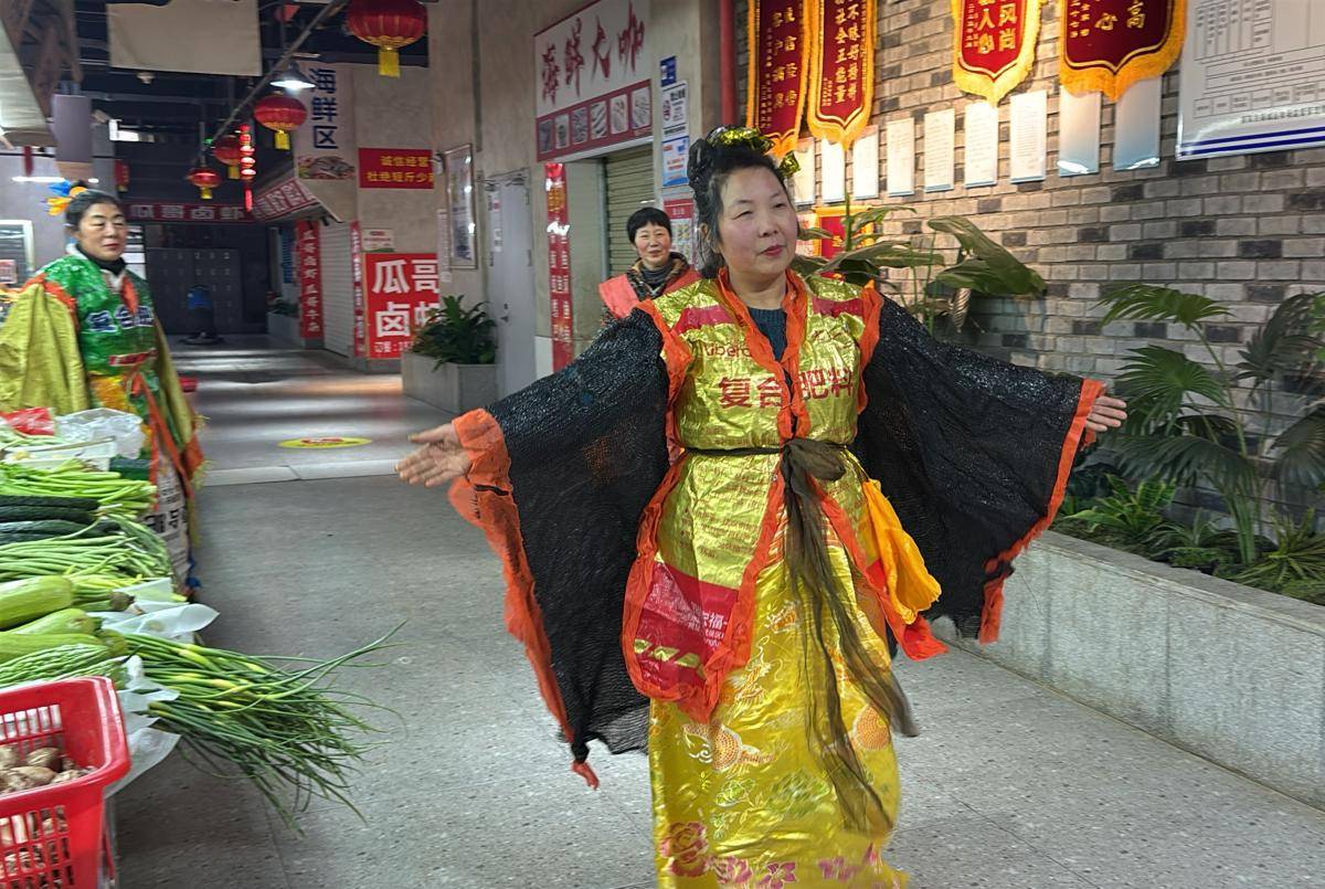 2月9日,襄阳市立业路生鲜荟市场内,穿上“宫服”走秀的张幺云。(湖北日报全媒记者 吴宇睿 摄)