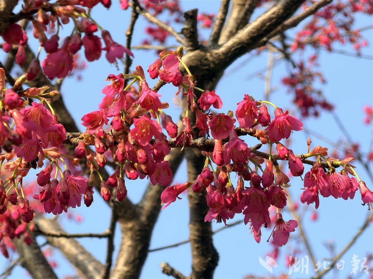 作为今年最早“抢跑”的龟山公园,樱花栈道旁的福建山樱花开得格外热烈。这批福建山樱是2021年引进的品种,早在1月上旬就率先开花。记者看到一些长势较好的樱花树,已有八成盛放,满树绛红色花朵如同小灯笼挂满枝头,正值最佳观赏期。