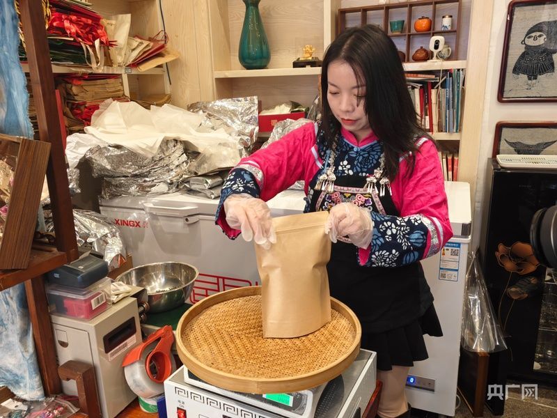 许明丽正将客户订购的茶叶进行打包发货(央广网记者 任振国 摄)