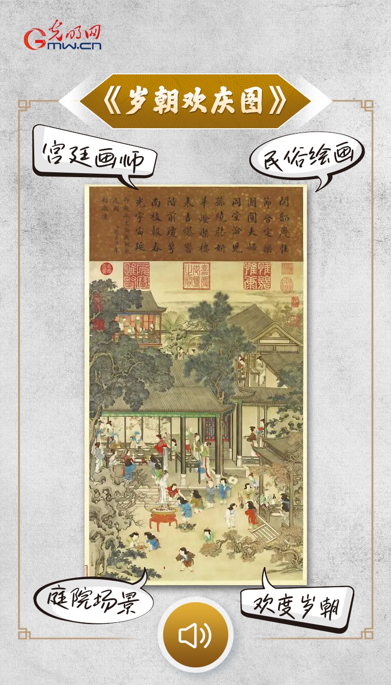 “又是一年春节到,大街小巷张灯结彩,好不热闹。你知道清代人们是怎么过春节的吗?在我这幅画卷上,就展现了一个清代家庭喜迎新春的场景。大人们或是在拜年,或是在为晚上的年夜饭忙碌地准备着。孩子们则在院子里开心地玩耍。祝愿看到这里的你,也将迎来一个喜庆祥和的春节。”