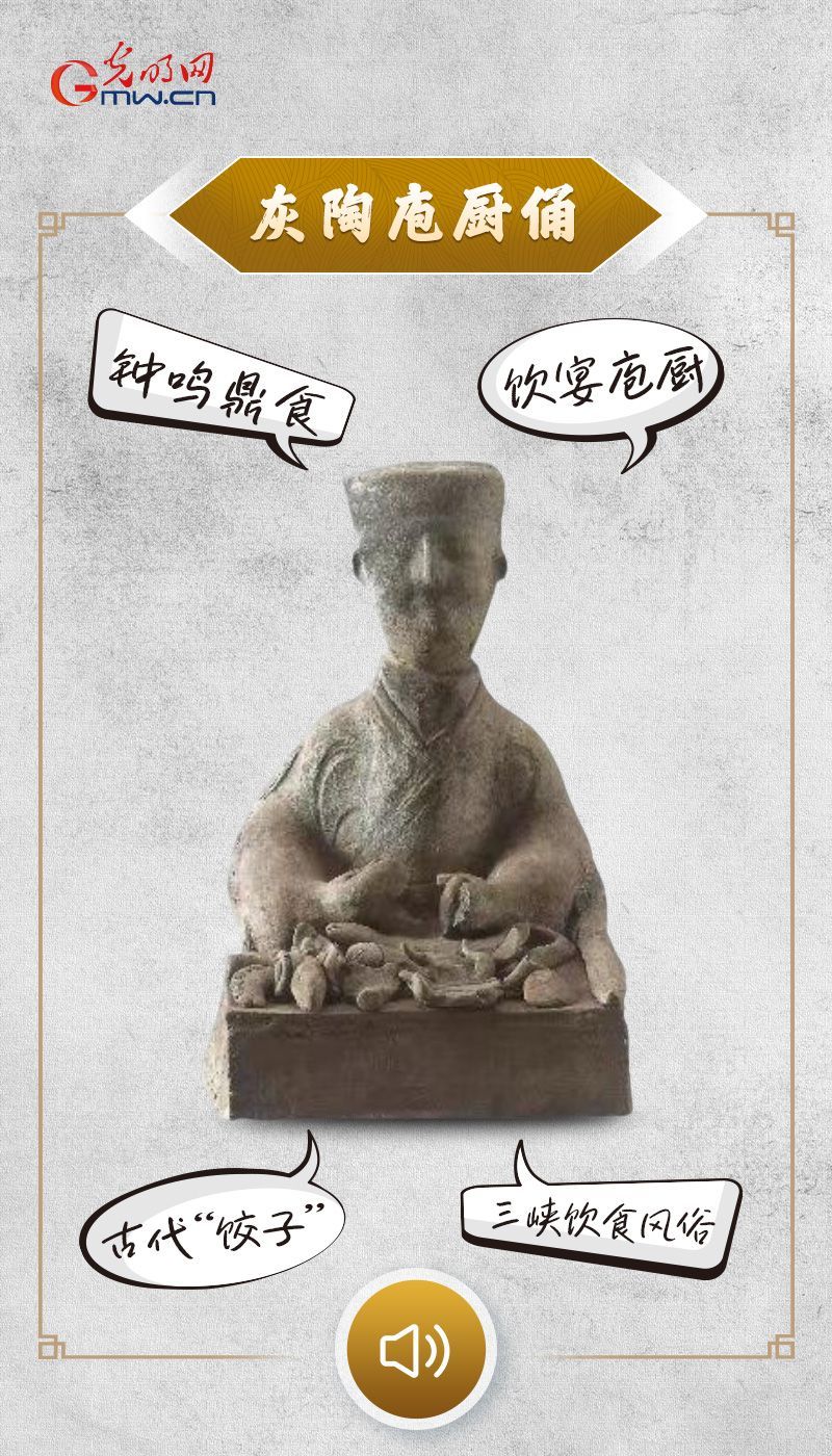 灰陶庖厨俑,三国蜀汉时期文物,出土于重庆市忠县涂井崖墓,现藏于四川省博物馆。俑旁的饺子形态与现代近似,还带着花边,是中国早期的“饺子”形象之一,佐证蜀汉时期三峡地区已出现饺子实物并流行开来。陶俑造型生动刻画庖厨劳作场景,反映蜀汉时期三峡地区饮食风俗。