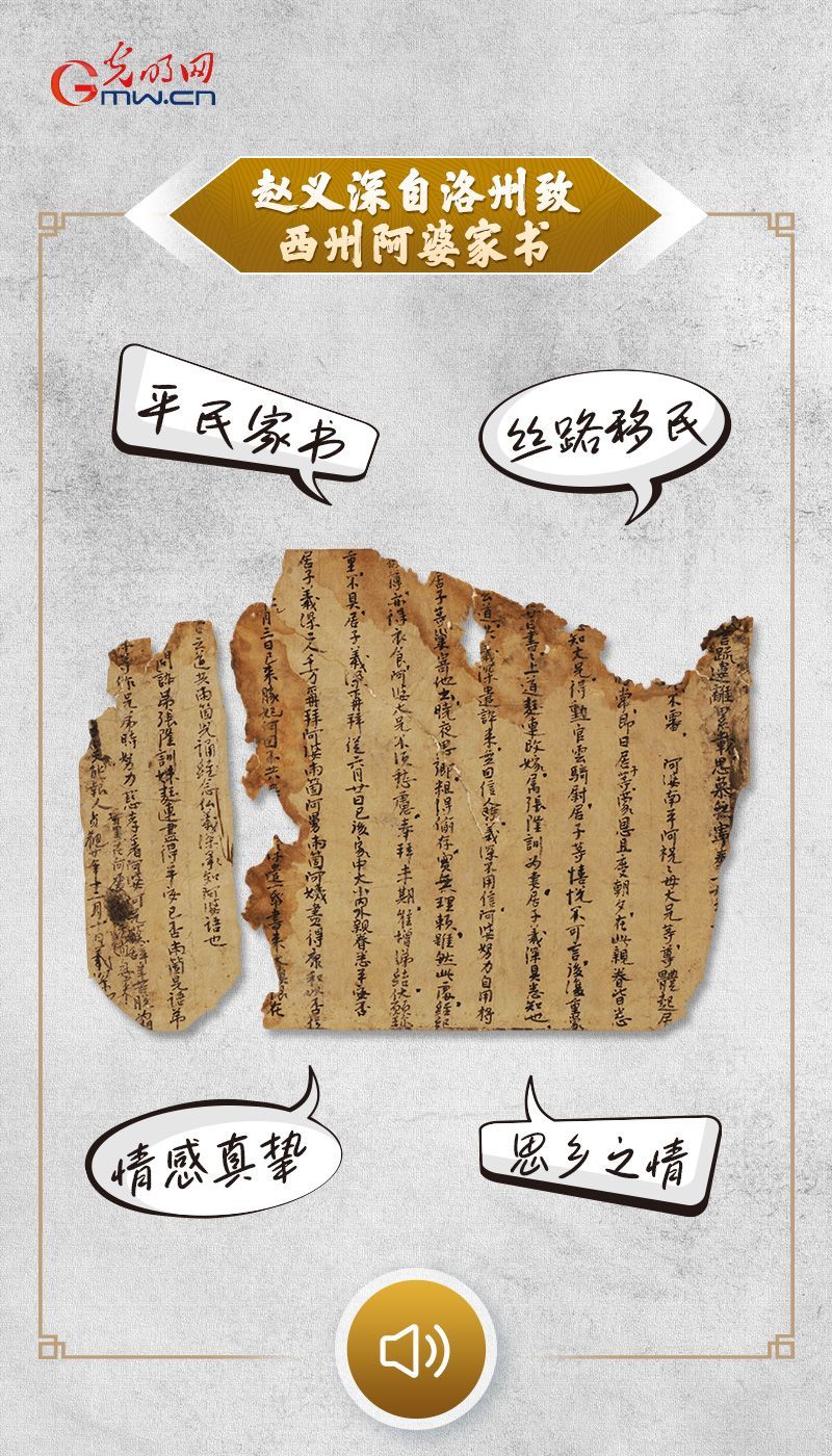 赵义深自洛州致西州阿婆家书,唐贞观年间文物,出土于新疆吐鲁番阿斯塔那古墓,现藏于新疆维吾尔自治区博物馆。信件内容主要为赵义深向西州(原高昌)母亲报平安,提及兄长升迁、叮嘱节俭并倾诉思乡之情。作为现存罕见的平民家书,其文字生动记录了丝路移民的生活细节与情感世界,是研究唐代社会生活史及邮驿制度的实物资料。
