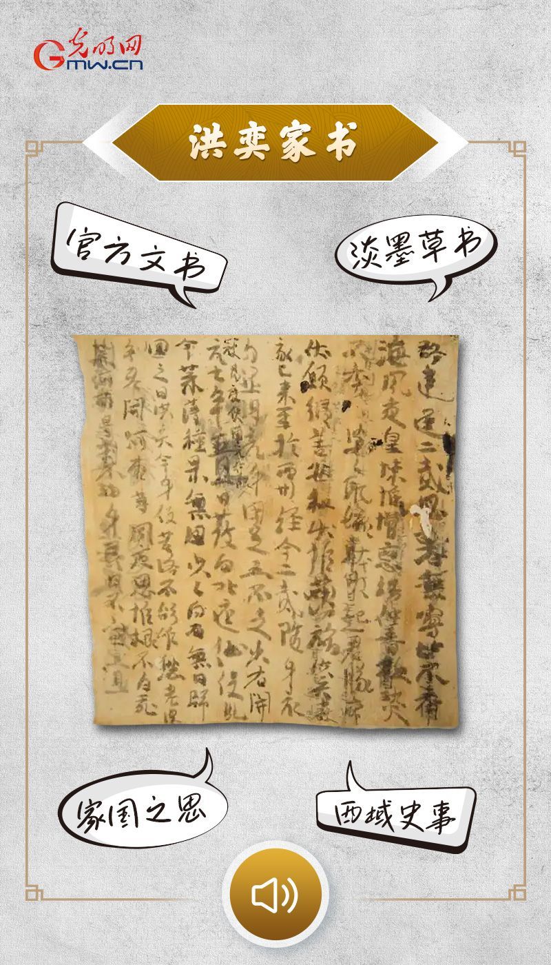洪奕家书2004年出土于新疆阿斯塔那古墓,现藏于吐鲁番博物馆。文书的正面是一份官方文书,背面则是一封唐代开元年间士兵的完整家书,因写信人署名“洪奕”,故被考古界称为《洪奕家书》。这封家书用淡墨草书书写,全文共有11列文字。文书字迹流畅,内容完整。这件文书不仅展现了一个普通戍边将士的愁思和情怀,同时对研究唐开元时期的一些西域史事及戍边将士的情况,也具有非常重要的意义,更是唐朝中央政府对西域实施行政管辖与治理的实证。