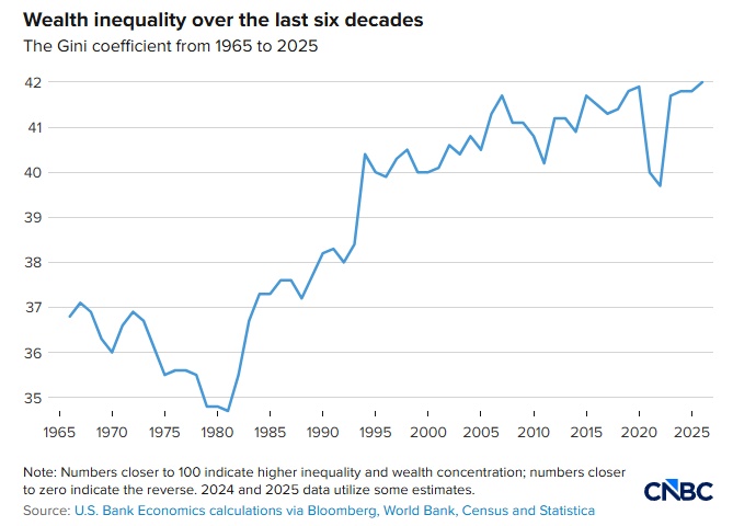 美国银行本月早些时候发布的一份报告显示,用于衡量财富集中程度的关键指标——基尼系数——已升至60年来的高位。