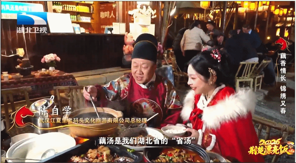 武汉江夏里老码头文化旅游有限公司总经理 陈自学:藕汤是我们湖北省的“省汤”,有种说法叫“无藕不成席”。藕的藕形,代表着我们大家团团圆圆,象征着藕断丝连,不管我们湖北人走到哪里、走得再远,我们那个乡情、乡愁,是一份浓浓的情谊。斩不断的思念,就是这个藕丝。