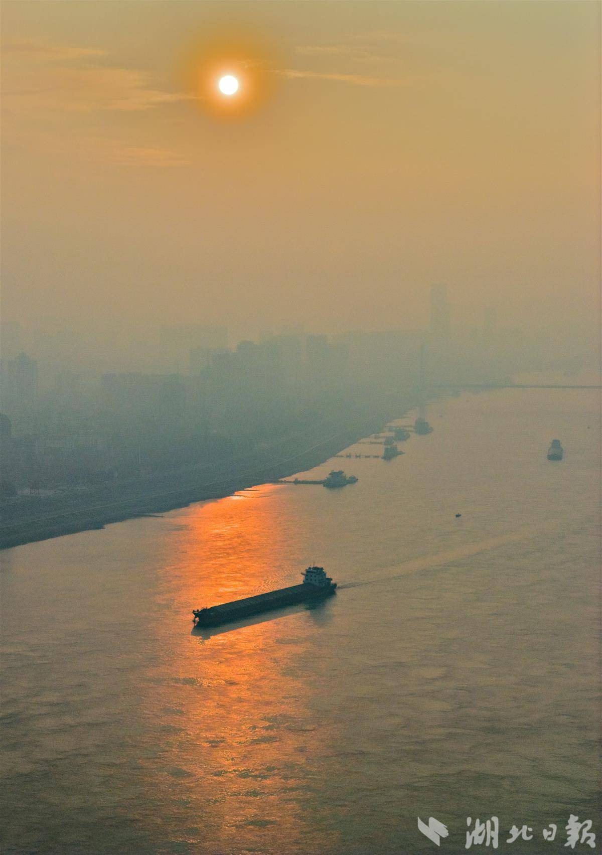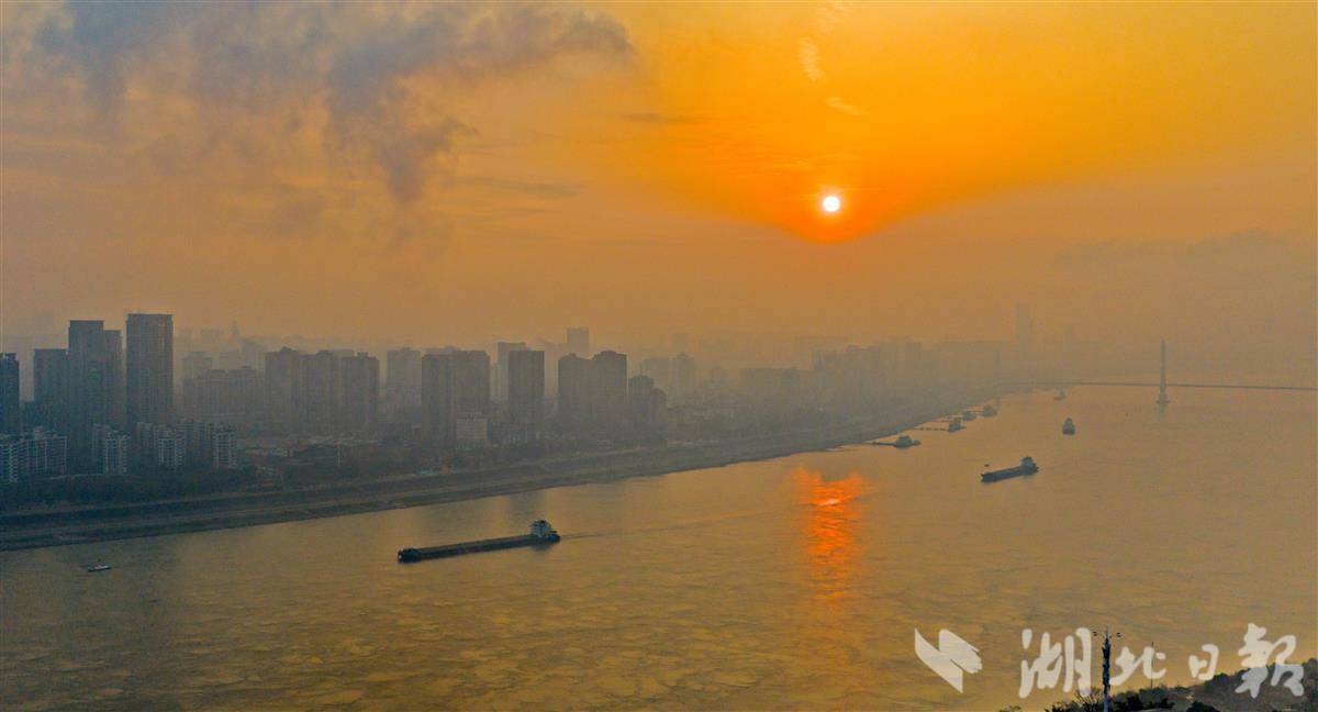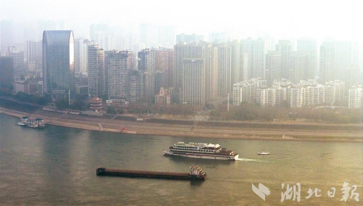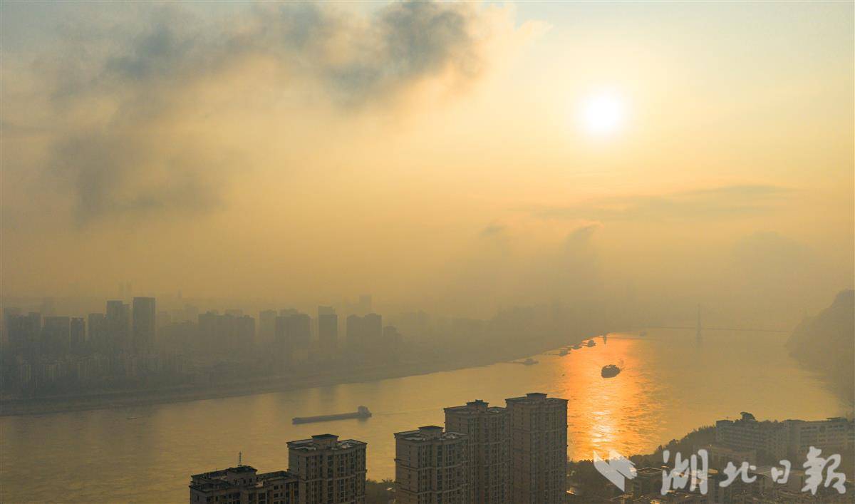 长江宜昌段江面波光粼粼,大小船舶在晨光中有序穿梭,航道畅通、一派祥和,尽显长江黄金水道新春新气象。
