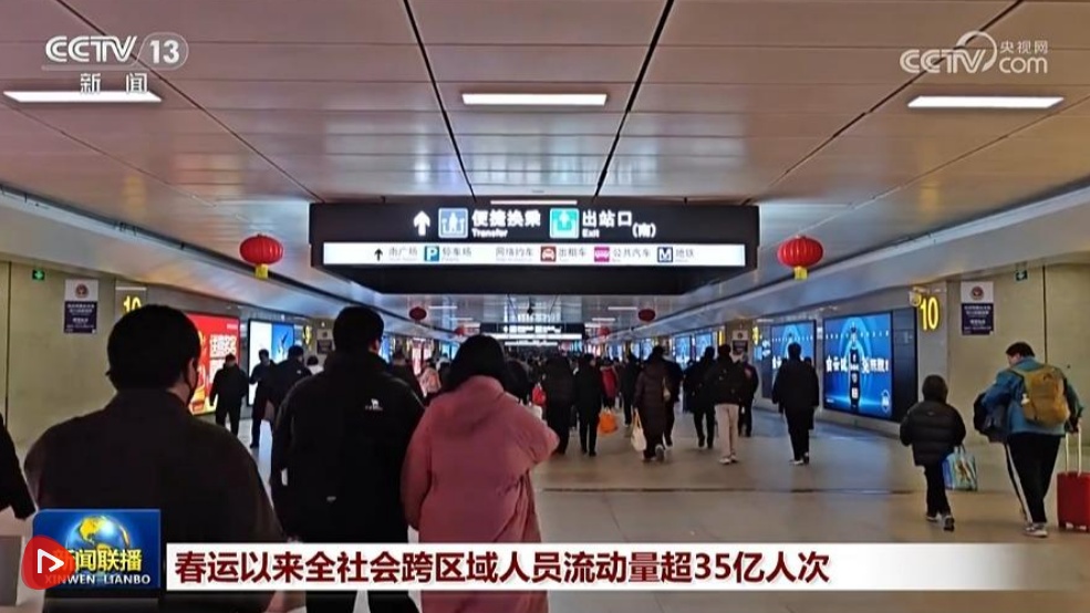 央视网消息(新闻联播):记者从交通运输部获悉,2月16日,全社会跨区域人员流动量超2.2亿人次,比2025年同期增长8.9%。春运启动以来,全社会跨区域人员流动量累计超35亿人次。