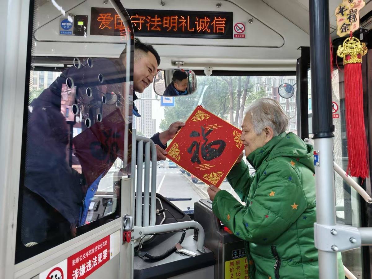 早上8时,徐飞驾驶的556路公交车停靠麒麟路汉桥村站,一位老婆婆小跑着上车,将一张手写“福”字递到他手中:“小徐,新年好!我特意等你的车,这福字送给你!”老婆婆笑着说,自己家住附近的旺达小区,每周都要坐556路公交车去马沧湖路李家嘴买菜,经常遇见徐飞,“他为人温和,开车稳当,每次都等我们老人坐稳才起步,还反复叮嘱大家扶好,这么多年,早已把他当成家人。”