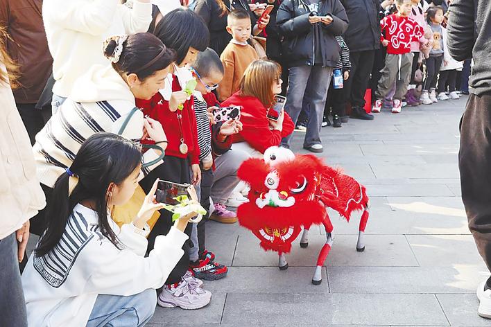 大年初一,武汉东湖绿道,同样上演着一场科技感十足的“东湖BOT”——身披醒狮装扮的仿生机器狗与舞龙舞狮队伍同台竞技。市民游客惊喜感叹:“昨晚刚在电视上看完机器人跳舞,今天就在东湖看到‘同款’,这年味儿也太潮了!”