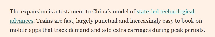 报道分析,高铁网络的快速扩张体现了中国以国家为主导推动技术进步的模式。列车不仅速度快,而且准点率很高。如今,通过手机应用程序订票也越来越便捷,这些应用能实时监测出行需求,并在客流高峰期增挂车厢。专家表示,中国的成功得益于多重因素的叠加:巨大的市场规模、标准化的设计以及有利的政策环境。