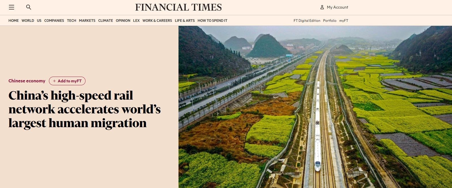 英国《金融时报》网站近日刊文称,中国春运期间出行客流比以往任何时候都来得更快、更集中,而中国高铁网为全球最大规模“人口流动”提供了重要支撑。