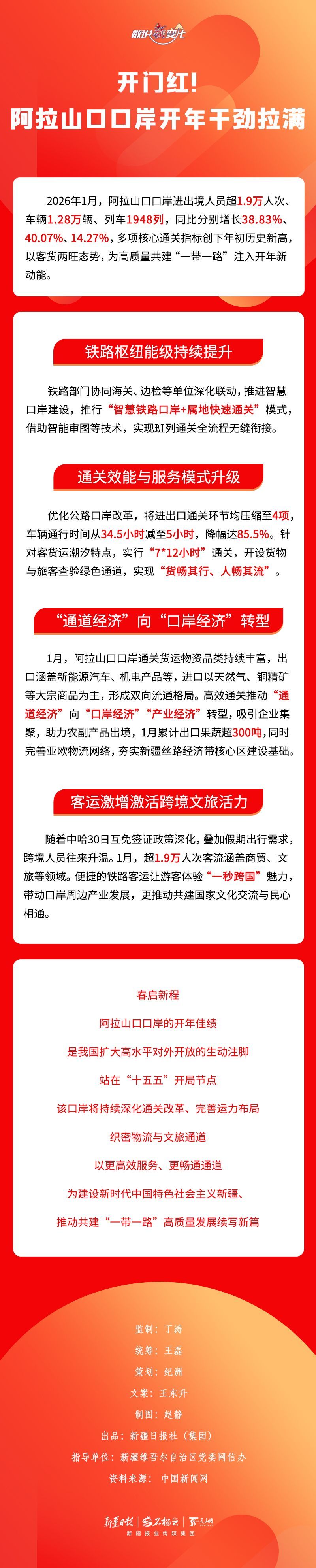 2026年1月,阿拉山口口岸进出境人员超1.9万人次、车辆1.28万辆、列车1948列,同比分别增长38.83%、40.07%、14.27%,多项核心通关指标创下年初历史新高。亮眼数据的背后,是口岸通关效能与服务模式的双重升级。本期《数说“新”变化》一起来看看。
