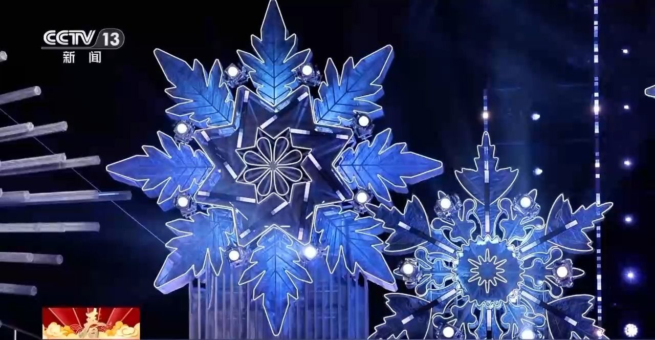 总台《2026年春节联欢晚会》哈尔滨分会场制片主任 曹天抒:有十朵雪花,每个雪花都是用特殊的一种钢网的材质,做出来晶莹剔透的效果。这个冰的制作,我们也花了很多心思。所以我们在制冰过程当中,加了一种白色的染料,让它更好地作为一个介质来反映投影,出现一个梦幻的、清楚的效果。