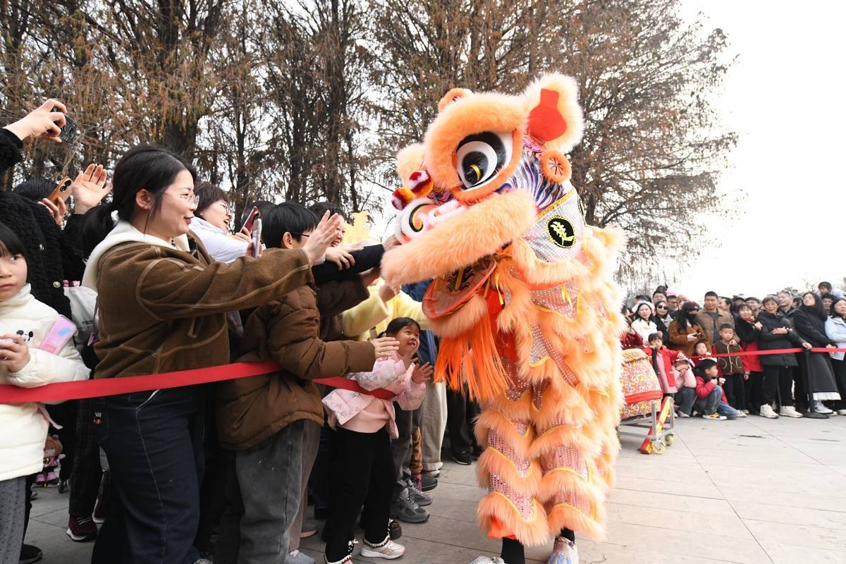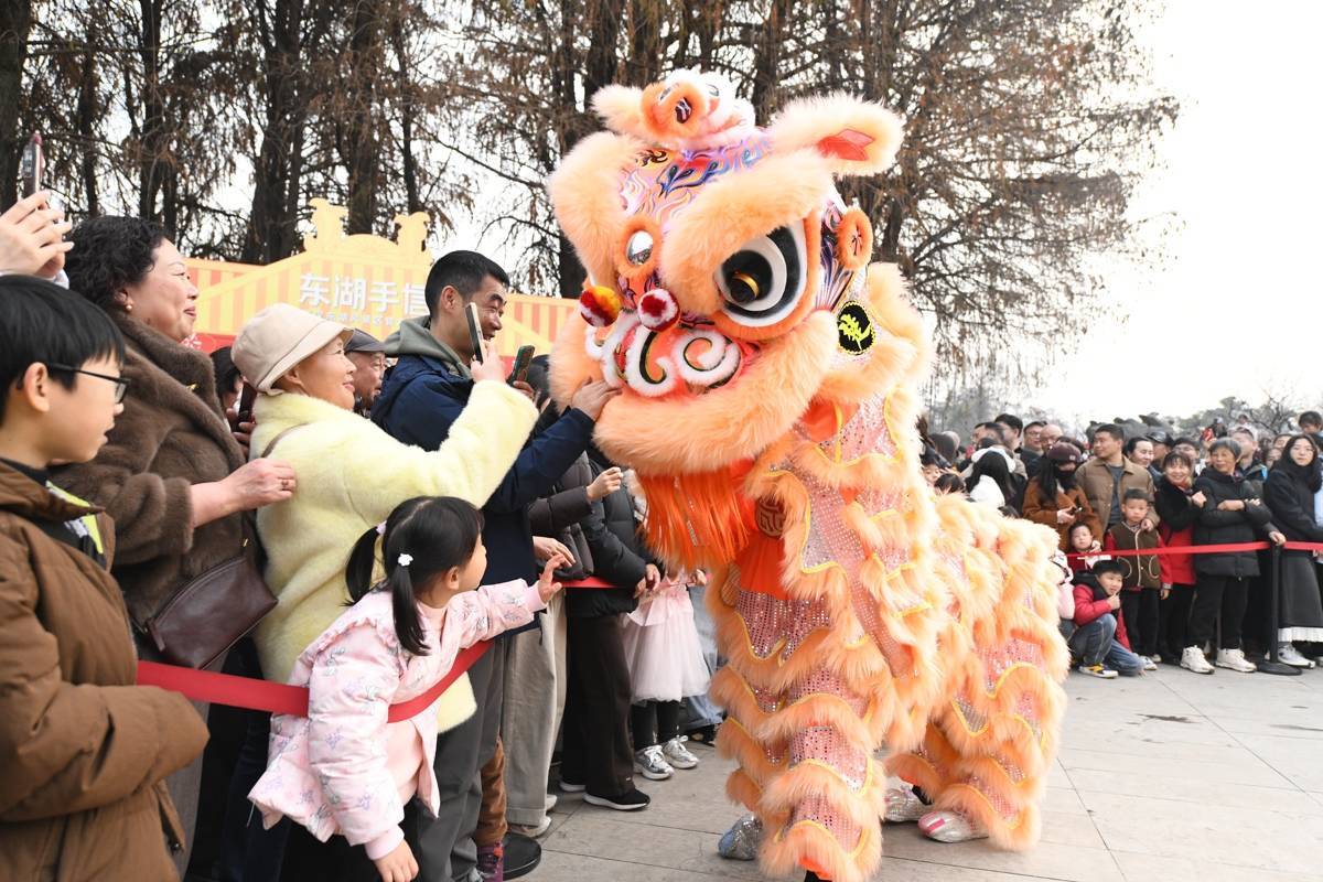 2026年2月19日,大年初三,武汉东湖梅园迎来盛花期,吸引大批市民游客前来踏春赏花。图位东湖梅园舞狮活动吸引大批市民游客前来围观。(湖北日报全媒记者 何宇欣 通讯员 邹卉 摄)
