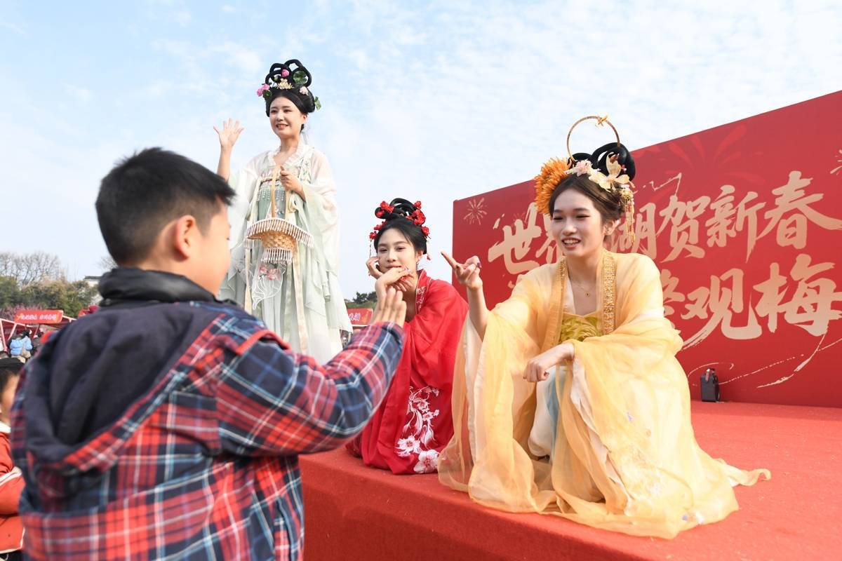 2026年2月19日,大年初三,武汉东湖梅园迎来盛花期,吸引大批市民游客前来踏春赏花。图位东湖梅园游园活动,身着汉服的NPC与游客互动。(湖北日报全媒记者 何宇欣 通讯员 邹卉 摄)