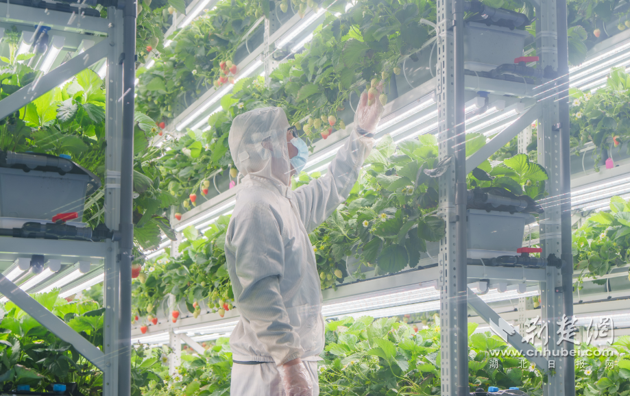 荆楚网(湖北日报网)讯(通讯员 李月媛 周星愿 张恒)大年初二,街巷灯笼映目,江城仍有寒意,坐落于武汉光谷的“植物方舟”智能种植工厂内却暖意融融。8层立体栽培架上,草莓娇艳欲滴。在这里,草莓摆脱季节更迭、病虫害的侵扰,在恒定的温湿度环境中生长,种植区洁净度可达十万级,为草莓营造了最佳生长条件。
