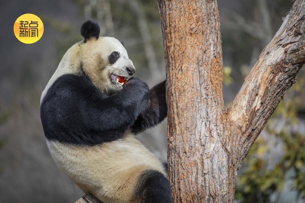 大熊猫在树杈上“吃零食”
