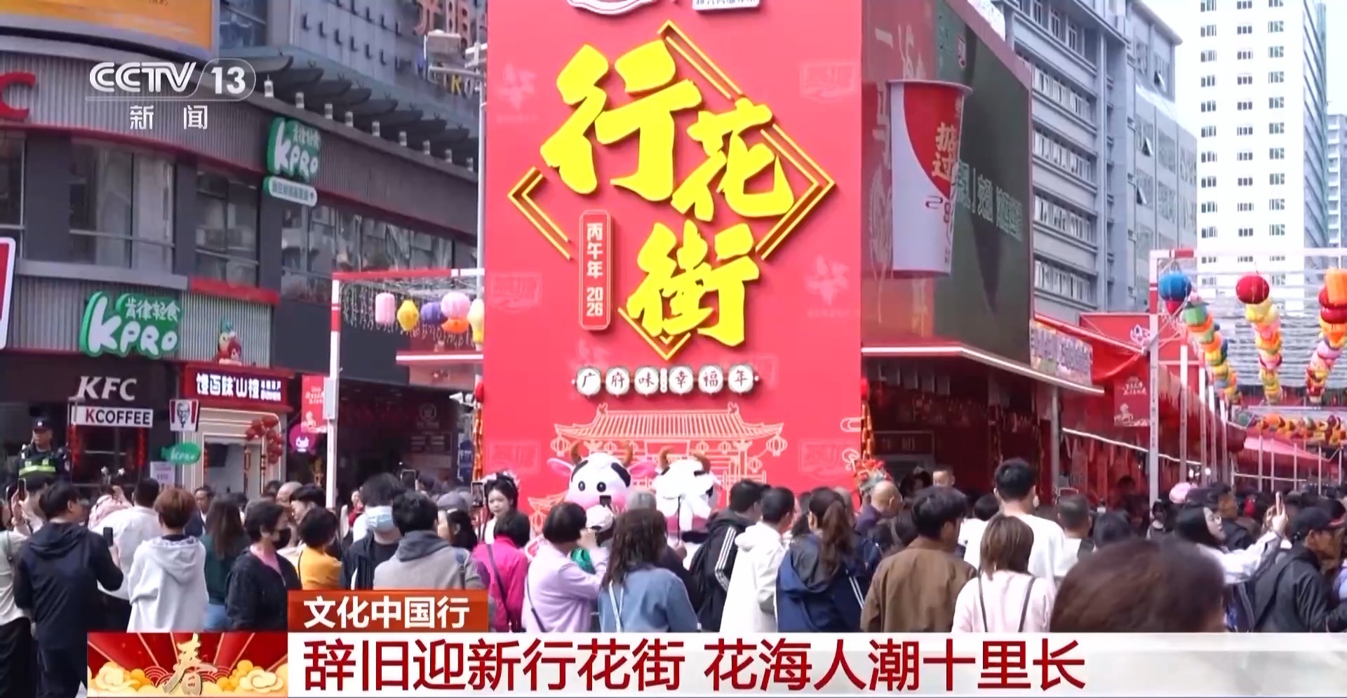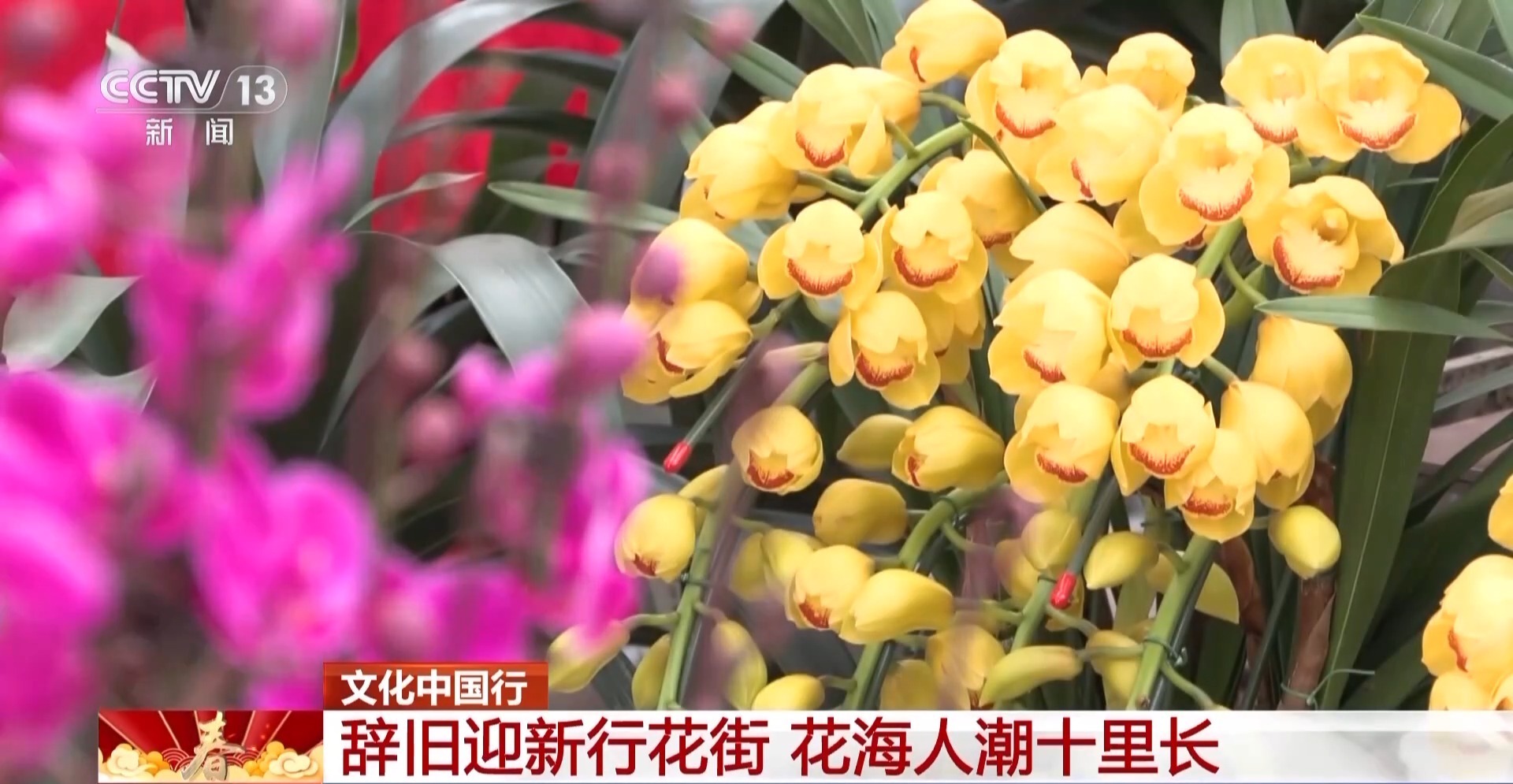 总台央视记者 邵舒宽:我现在所在的位置就是广州最具代表性的迎春花市——越秀西湖花市的主牌楼外。牌楼是岭南迎春花市重要的一个组成部分。岭南花市萌芽于唐宋时期,而今年这里的主牌楼正是以宋代广州共乐楼作为原型设计的。以前竖起高高的牌楼,人们就知道这里聚集了迎春的花市,而如今,凝聚着古韵新风和地方特色的牌楼不仅是花市的入口,更是一座座时空之门,以花为引,带领游人穿梭其中,感受中华优秀传统文化在新时代绽放的璀璨光彩。